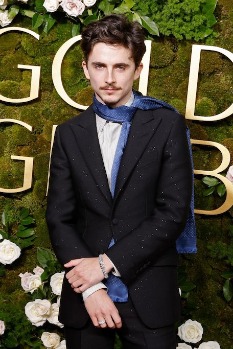 Meanwhile, the Bones and All actor rocked a suit adorned with a thin blue scarf that paid homage to his role as Bob Dylan in A Complete Unknown.