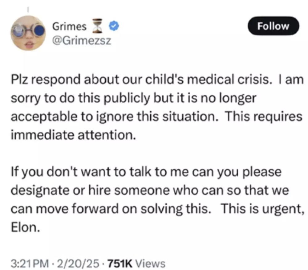 Grimes and Musk share three children: X Æ A-Xii, Exa Dark Sideræl, and Techno Mechanicus. She did not specify which child is affected or the nature of the medical crisis.